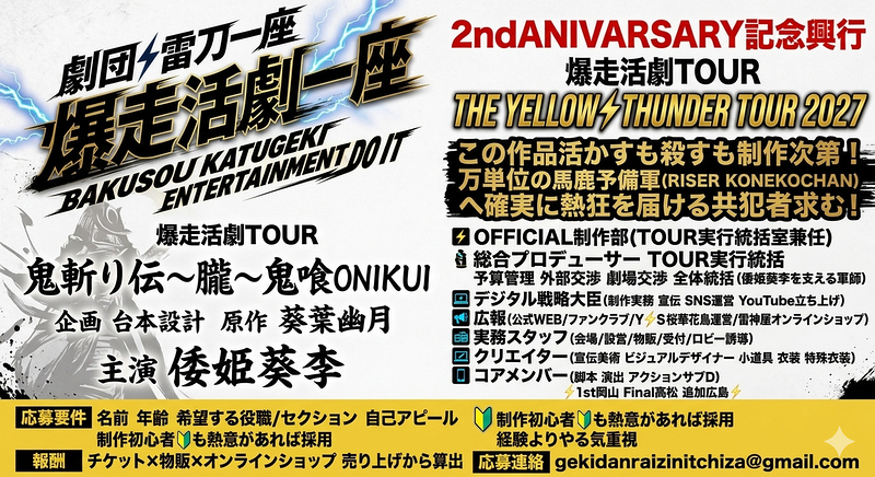 劇団雷刀一座 2nd ANNIVERSARY 記念興行 爆走活劇TOUR 「THE YELLOW THUNDER TOUR 2027」 演目:『鬼斬り伝〜朧〜鬼喰 ONIKUI』