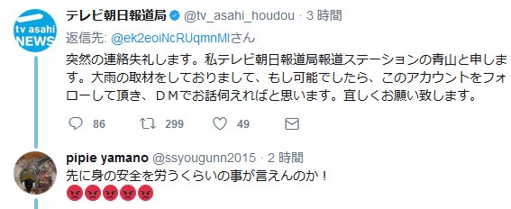 【大雨特別警報】福岡県朝倉市内で救助を求めているツイートに対して、テレビ朝日はこの返事。流石としか言いようがありません。pipie yamano氏の怒り、ごもっともです😡😡😡 #テレビ朝日 #報道ステーション https://t.co/tILCxL7oqq #テレビ朝日 #報道ステーション