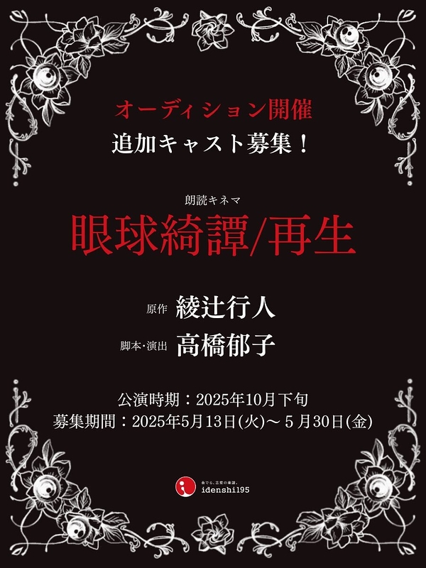 独自の脚本[言葉の楽譜]と、語り手の「声」に宿る力を最大限に生かす演出で、立体的な朗読空間を創り上げてきたidenshi195が、新たな出会いを求めて、2025年10月上演予定の朗読キネマ『眼球綺譚/再生』の出演者オーディションを行います。