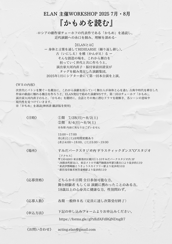 これから演劇を担っていく舞台人が身体と心を通し 古典や時代を牽引した作家の戯曲に触れる機会を作ろうと、ELAN発信で始めた演劇WSです。