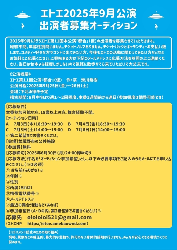本番参加可能な方、18歳以上の方。舞台経験不問。