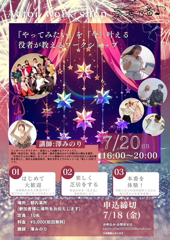 初めてお芝居に挑戦してみたい方、久しぶりに演技をやってみたい方、他とは違うワークショップを体験してみたい方、どなたでも大歓迎です!
