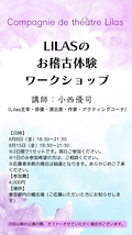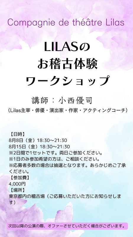 俳優としてのスキルアップはもちろん、Lilasの演劇観や方向性に共感し、ともに創作を進められる仲間と出会うことを目的とした“出会いの場”です。