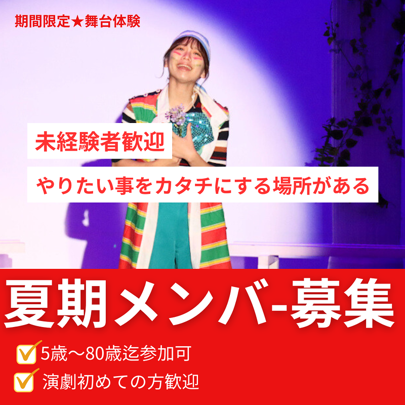 普段の生活では出会う事のない「世代」「職業」の仲間と一緒に期間限定で舞台にチャレンジしませんか?演劇初めての方も、ブランクある方も大歓迎!