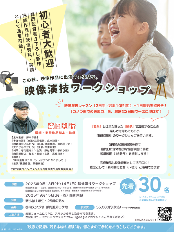 2025年9月、都内で開催される「映画出演体験ワークショップ」は、小学1年生〜25歳までの若者を対象に、未経験からでもセリフ付きで短編映画に出演できる特別な3日間プログラムです。