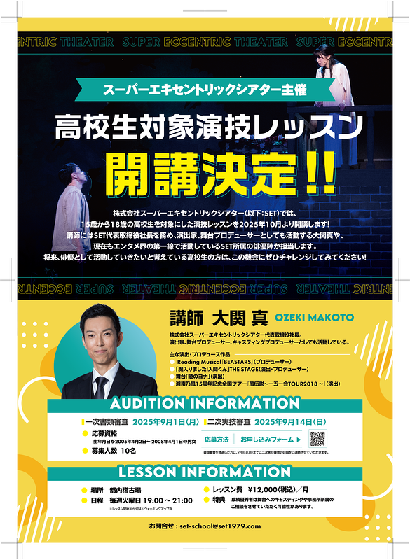株式会社スーパーエキセントリックシアターでは、15歳から18歳の高校生を対象にした演技レッスンを2025年10月より開講します!