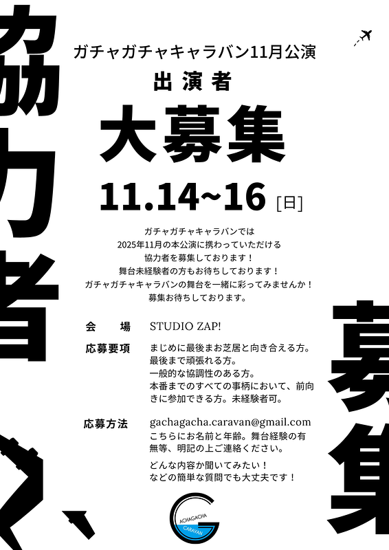 【日 程】2025年11月14日(金)~11月16日(日)全5~7公演(現在調整中) 小屋入りは11月13日(木)~(予定)になります。 ※公演数、公演日が変更となる場合がございます。 ※仕込みへの参加、協力は必須とさせていただきます。