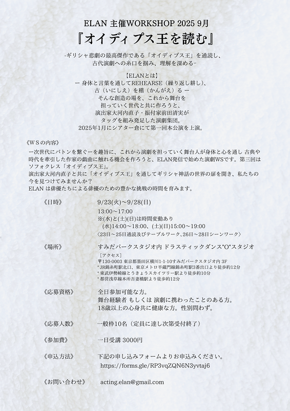 ー次世代にバトンを繋ぐーを趣旨に、これから演劇を担っていく舞台人が身体と心を通し 古典や時代を牽引した作家の戯曲に触れる機会を作ろうと、ELAN発信で始めた演劇WSです。第三回はソフォクレス「オイディプス王」。