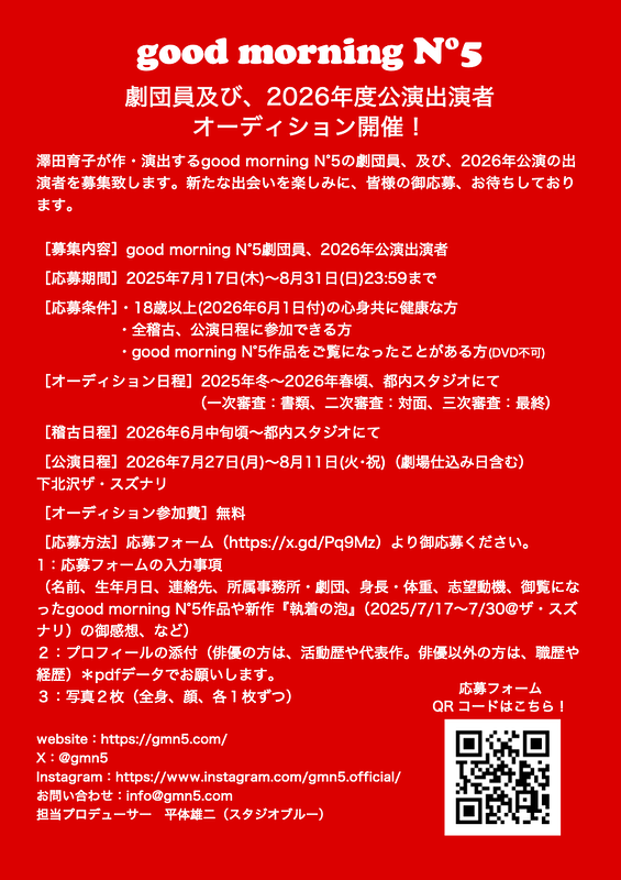 (名前、生年月日、連絡先、所属事務所・劇団、身長・体重、志望動機、御覧になったgood morning N°5作品や新作『執着の泡』(2025/7/17〜7/30@ザ・スズナリ)の御感想、など)