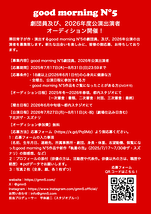 澤田育子が作・演出するgood morning N°5の劇団員、及び、2026年公演の出演者を募集致します。新たな出会いを楽しみに、皆様の御応募、お待ちしております。