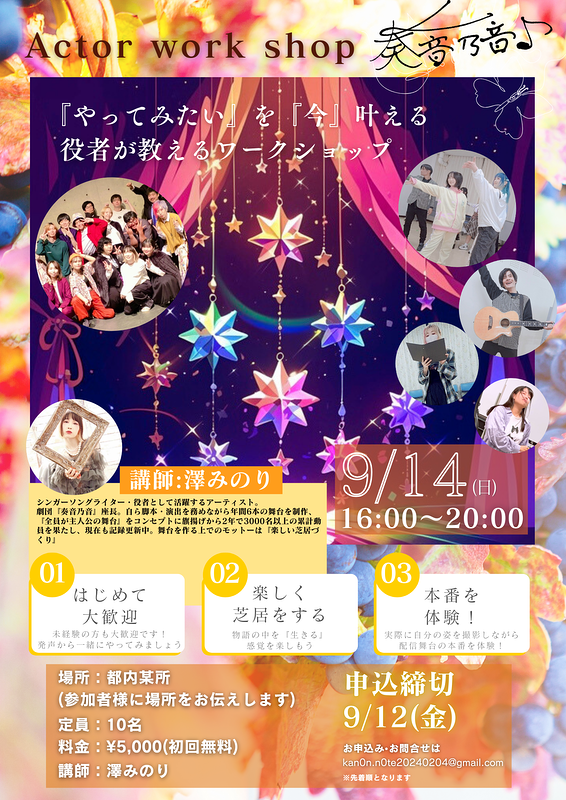初めてお芝居に挑戦してみたい方、久しぶりに演技をやってみたい方、他とは違うワークショップを体験してみたい方、どなたでも大歓迎です!