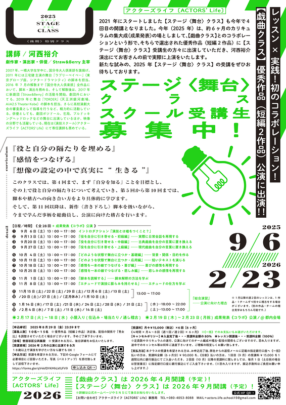 本ワークショップでは、参加者に対する暴言・恫喝・威圧的な指導は一切行いません。年齢・性別などの属性に基づく差別的な言動・行動も認めません。演技指導上で身体的接触が必要な場合は、事前に目的と範囲を説明し、本人の同意を得たうえで実施します。未成年の参加には、保護者(親権者)の同意書提出を必須とします。