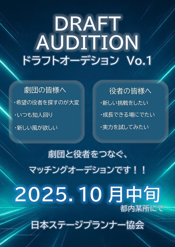 日本ステージプランナー協会では、新企画「ドラフトオーディション」に出演いただける役者を募集いたします。