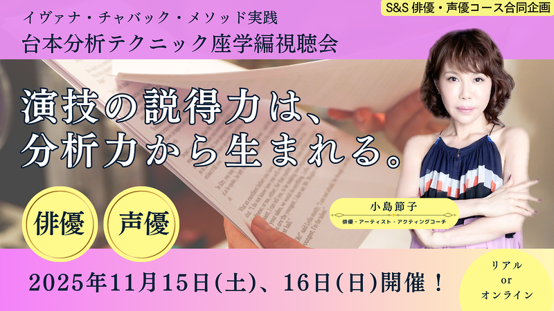 本講座は、ハリウッドで広く支持されるイヴァナ・チャバック・メソッドを基に、 小島節子が実践する台本分析の真髄を学びます。