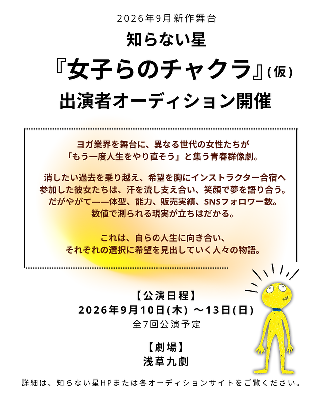 作中、ヨガの動きを用いた場面が含まれる予定のため、ヨガ経験者や身体を動かすことが得意な方を歓迎いたします。もちろん、未経験の方でも問題ございません。