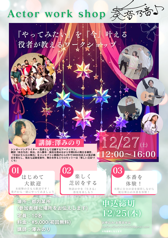 初めてお芝居に挑戦してみたい方、久しぶりに演技をやってみたい方、他とは違うワークショップを体験してみたい方、どなたでも大歓迎です!