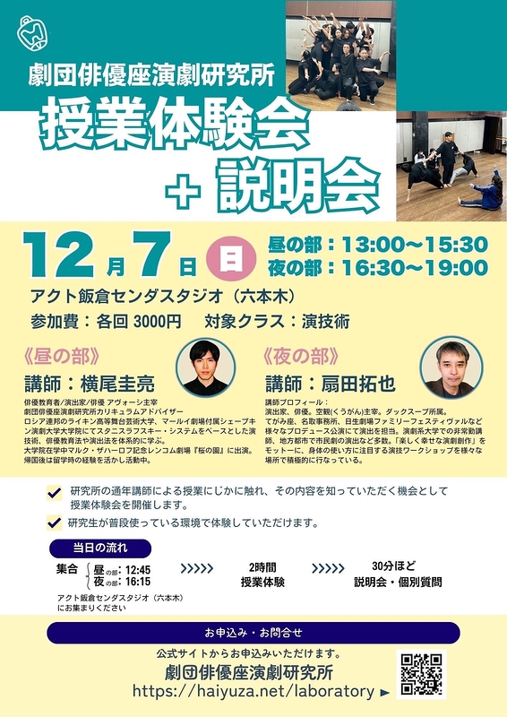 一般の演劇ワークショップとは異なりますので、研究所のパンフレット等をご確認の上、お申込み下さい。