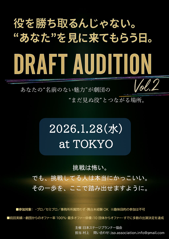 下記メールアドレスへ「ドラフトオーデション参加について」の件名でメールをお送りくださいませ。