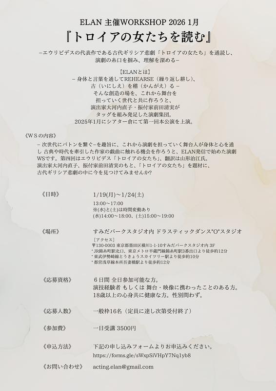 ー次世代にバトンを繋ぐーを趣旨に、これから演劇を担っていく舞台人が身体と心を通し 古典や時代を牽引した作家の戯曲に触れる機会を作ろうと、ELAN発信で始めた演劇WSです。第四回はエウリピデス「トロイアの女たち」。