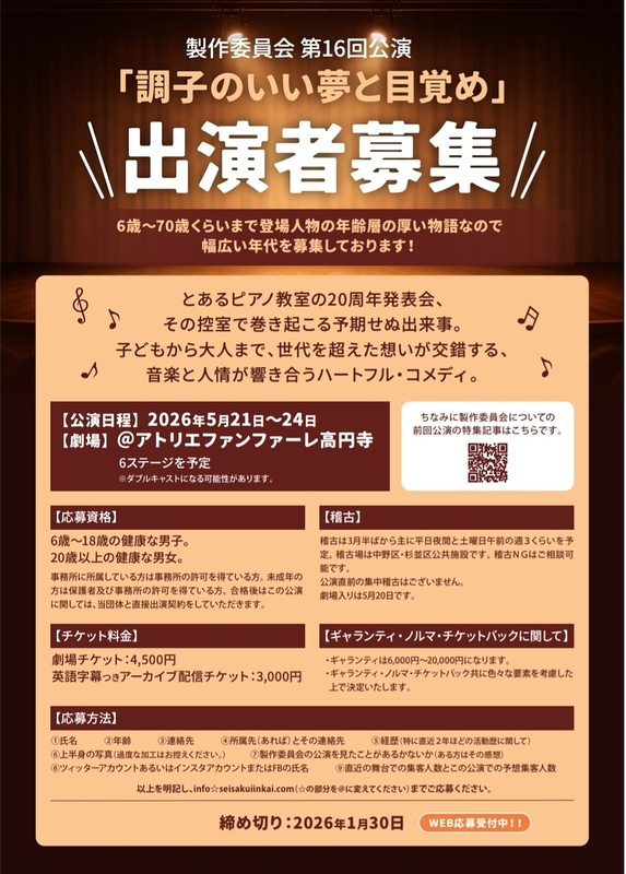 事務所に所属している方は事務所の許可を得ている方。未成年の方は保護者及び事務所の許可を得ている方。合格後はこの公演に関しては、出演者及び未成年の出演者の方は保護者の方が、当団体と直接出演契約をしていただきます。