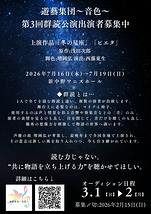 年齢不問。舞台経験者や朗読経験者、演じるのが好きな方、朗読が好きな方歓迎。