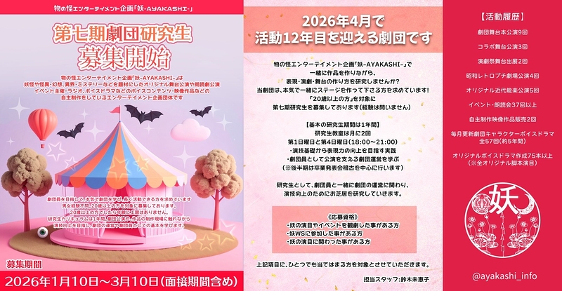 ayakashiinfo@gmail.comまで下記必要事項を必ず明記の上ご応募下さい。