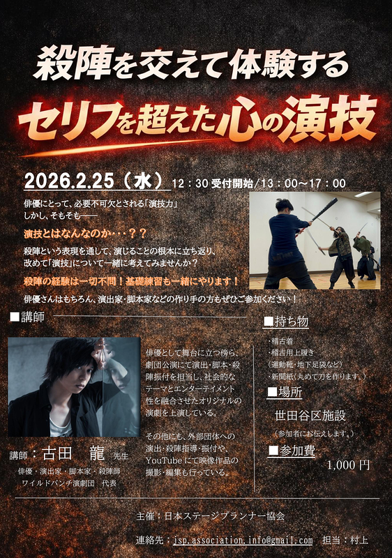 俳優・演出家・脚本家・殺陣師として活動する 古田龍 先生 を講師に迎え、
