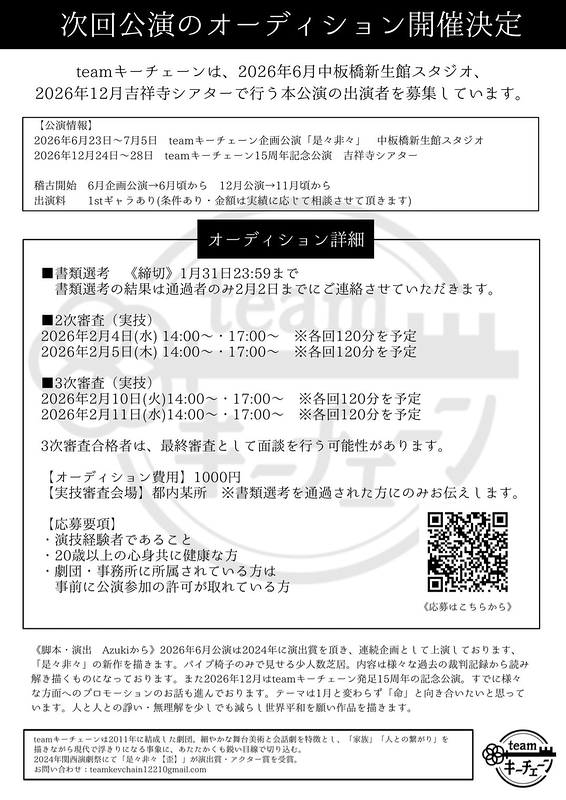 teamキーチェーン 2026年6月<企画公演>新生館シアター 12月公演<本公演>吉祥寺シアター オーディション