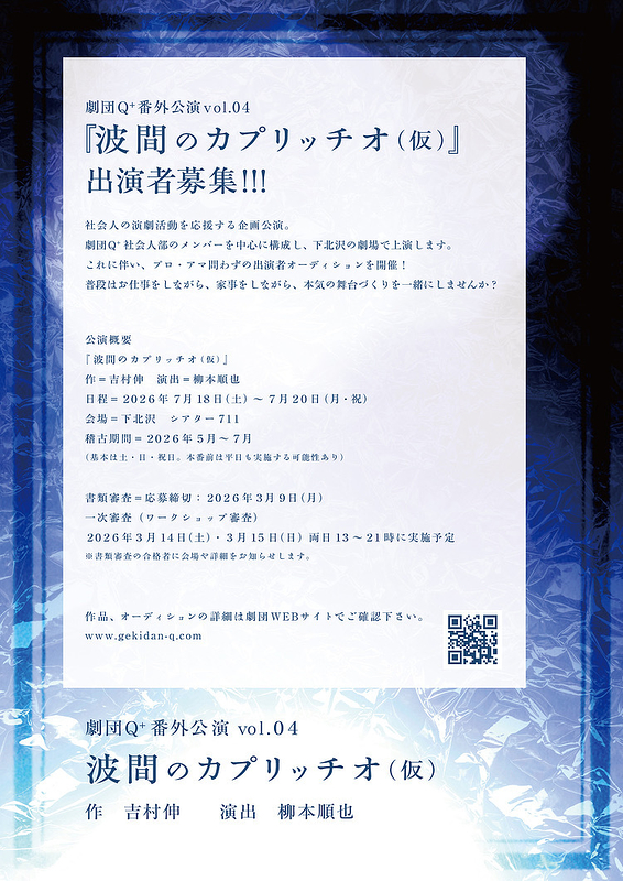 劇団Q+社会人部のメンバーを中心に構成し、下北沢の劇場で上演します。これに伴い、プロ・アマ問わずの出演者オーディションを開催!