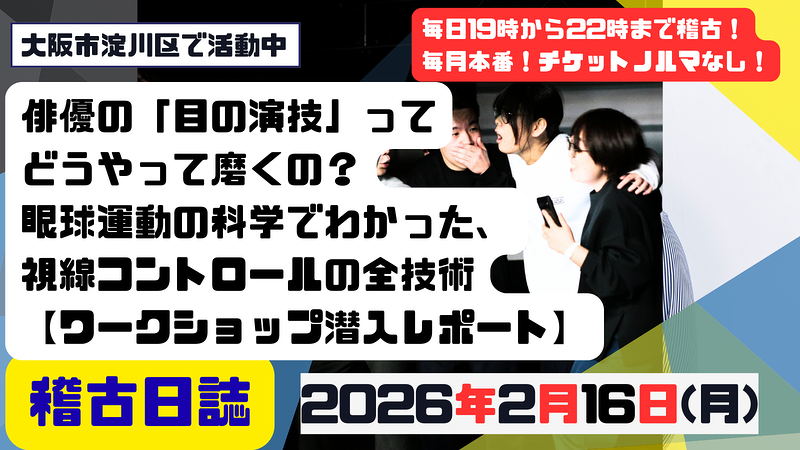 「俳優 目の演技 やり方」「俳優 視線 コントロール」「演技 目が泳ぐ 改善」「サッカード スムースパシュート 演技」「演技ワークショップ 目の使い方」「舞台俳優 ビジョントレーニング」「演技 上達 目」「俳優 緊張 目が泳ぐ」