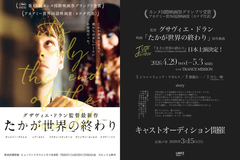 カンヌ国際映画祭グランプリ受賞:映画「たかが世界の終わり」(グザヴィエ・ドラン監督)原作『まさに世界の終わり』2026年4月、日本上演決定!