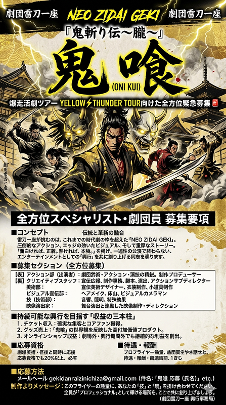 ■ 応募方法 メールにて以下の情報をお送りください。 【宛先】gekidanraizinichiza@gmail.com (劇団雷刀一座 興行事務局) 【件名】「鬼喰 応募(氏名)」 【本文】