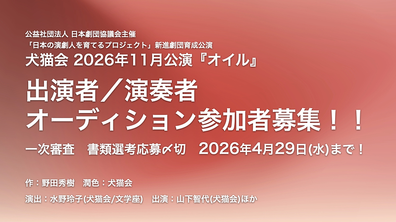 日本劇団協議会主催「日本の演劇人を育てるプロジェクト」新進劇団育成公演 犬猫会『オイル』作:野田秀樹 演出:水野玲子(犬猫会/文学座) 出演:山下智代ほか の出演者・演奏者を募集するためのオーディションを開催いたします。