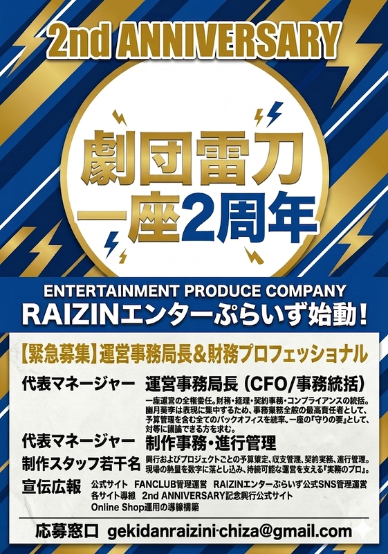 「全員バカになれ。楽しめてるか、バカになれてるか。」 2周年を迎え、さらなる「限界突破」を目指す雷刀一座は、エンターテインメント・プロデュース事務所**「RAIZINエンターぷらいず」**として新たなステージへ。