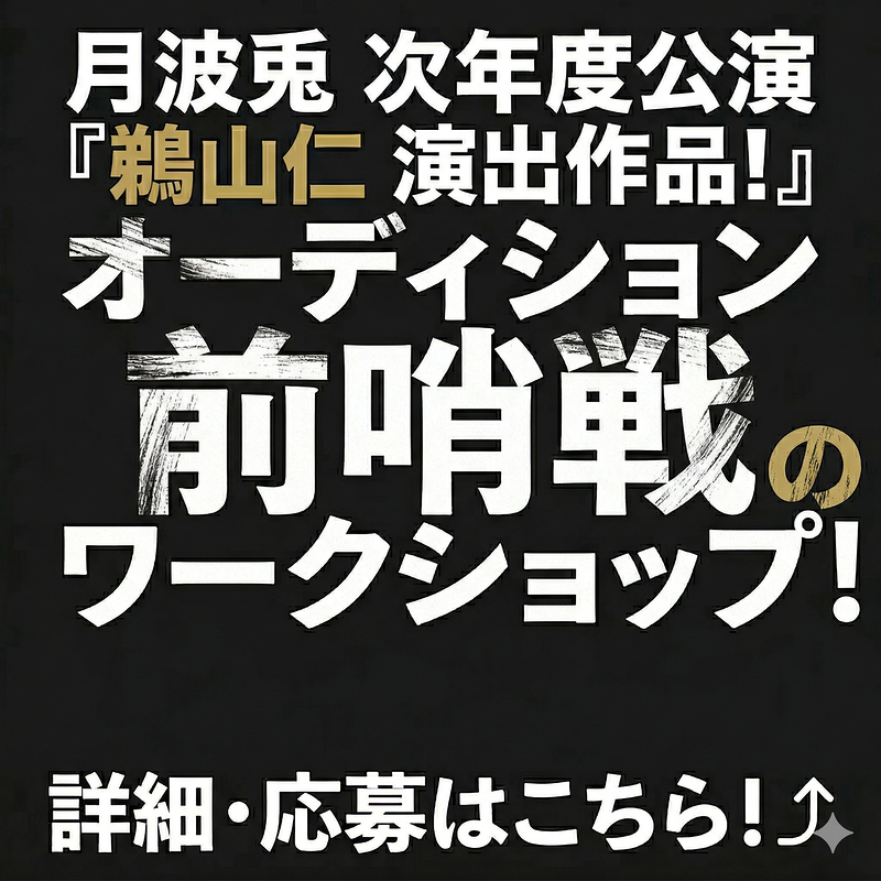 また、7月からは来年の公演『佃典彦作、鵜山仁演出作品』のオーディション募集が始まります。これはその前哨戦!鵜山氏の演出作品に出られるチャンスはそうそう無いですよ!