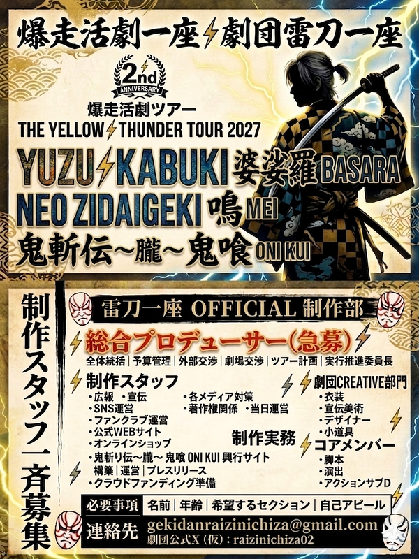 • 求める人物: 言葉の力を信じ、デジタルの海から「雷刀一座」を見つけ出させるプロモーション能力を持つ方。後の全国ツアー見据えた布陣