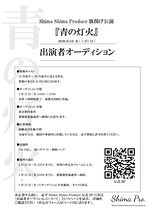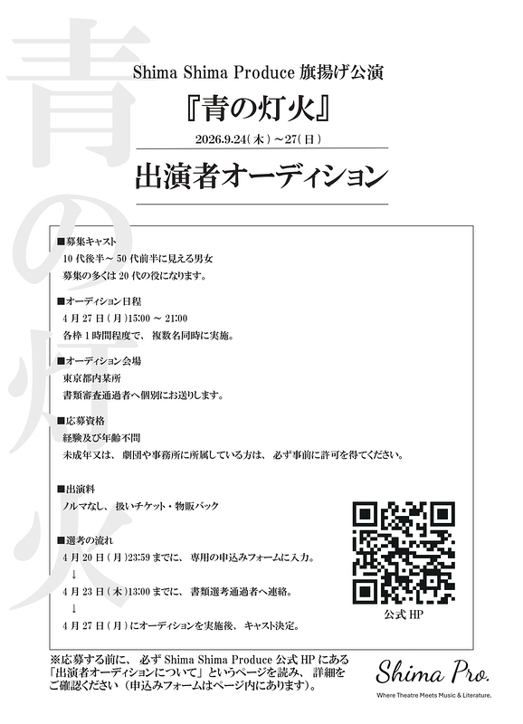 この度、Shima Shima Produce旗揚げ公演『青の灯火』を上演するにあたり、現在活動されている役者さんは勿論、役者を志している方や、様々な世界で活躍されている方との新たな出会いを求めて一緒に作品を盛り上げてくださるキャストを募集するため、出演者オーディションを開催する運びとなりました。