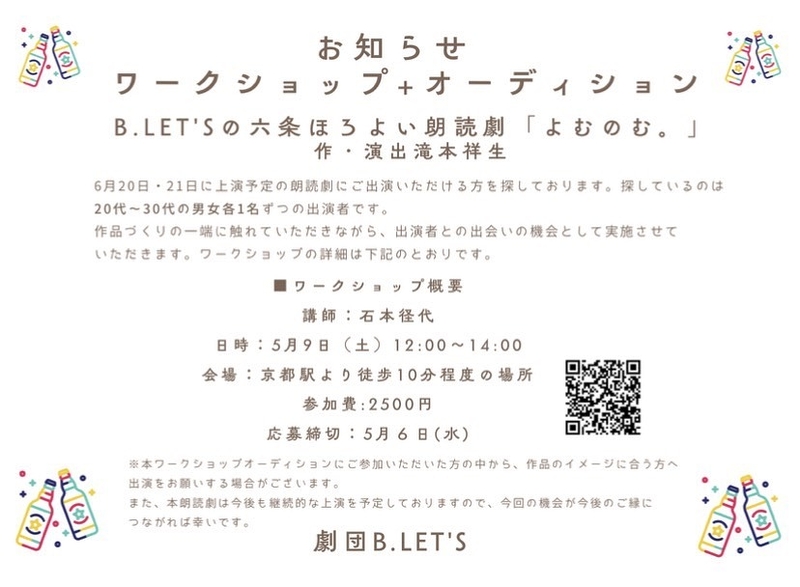 6月20日・21日に京都で上演予定のB.LET'Sの六条ほろよい朗読劇公演「よむのむ。」