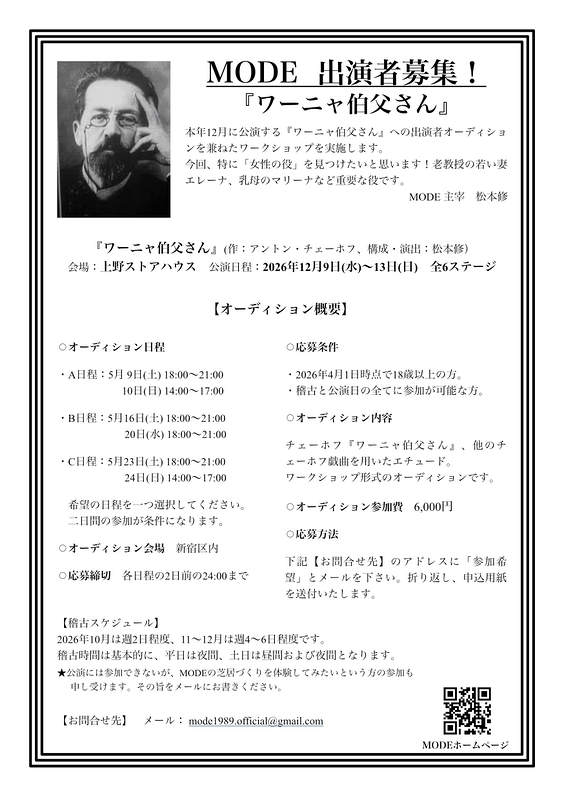 老教授の若い妻エレーナ、乳母のマリーナなど重要な役です。今回の公演には出演できないがMODEの芝居づくりを体験してみたい方の参加もOKです。 奮ってご応募ください!