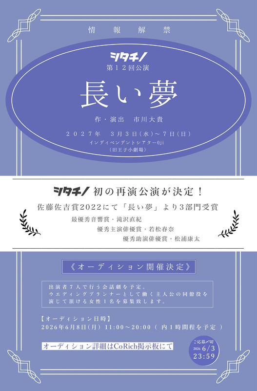 2027年3月に上演を予定している、シタチノ第12回公演の出演者オーディションを行います。