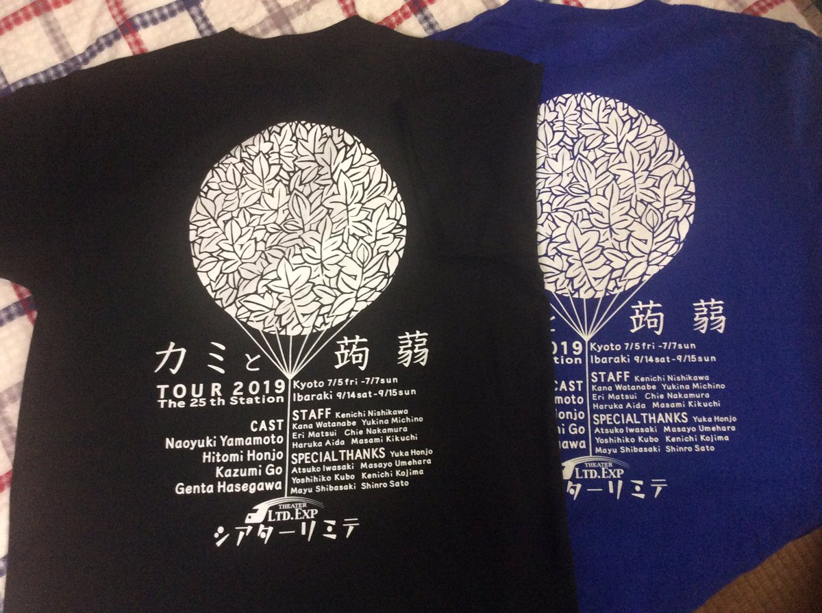 カミと蒟蒻 ツアーTシャツ !!! さっき、届きたてホヤホヤぁー。 今日、劇団員のみんなに配布のため、稽古場へ。 そして、今日は、、京都公演の小屋入り! https://t.co/CTW98K8zdu