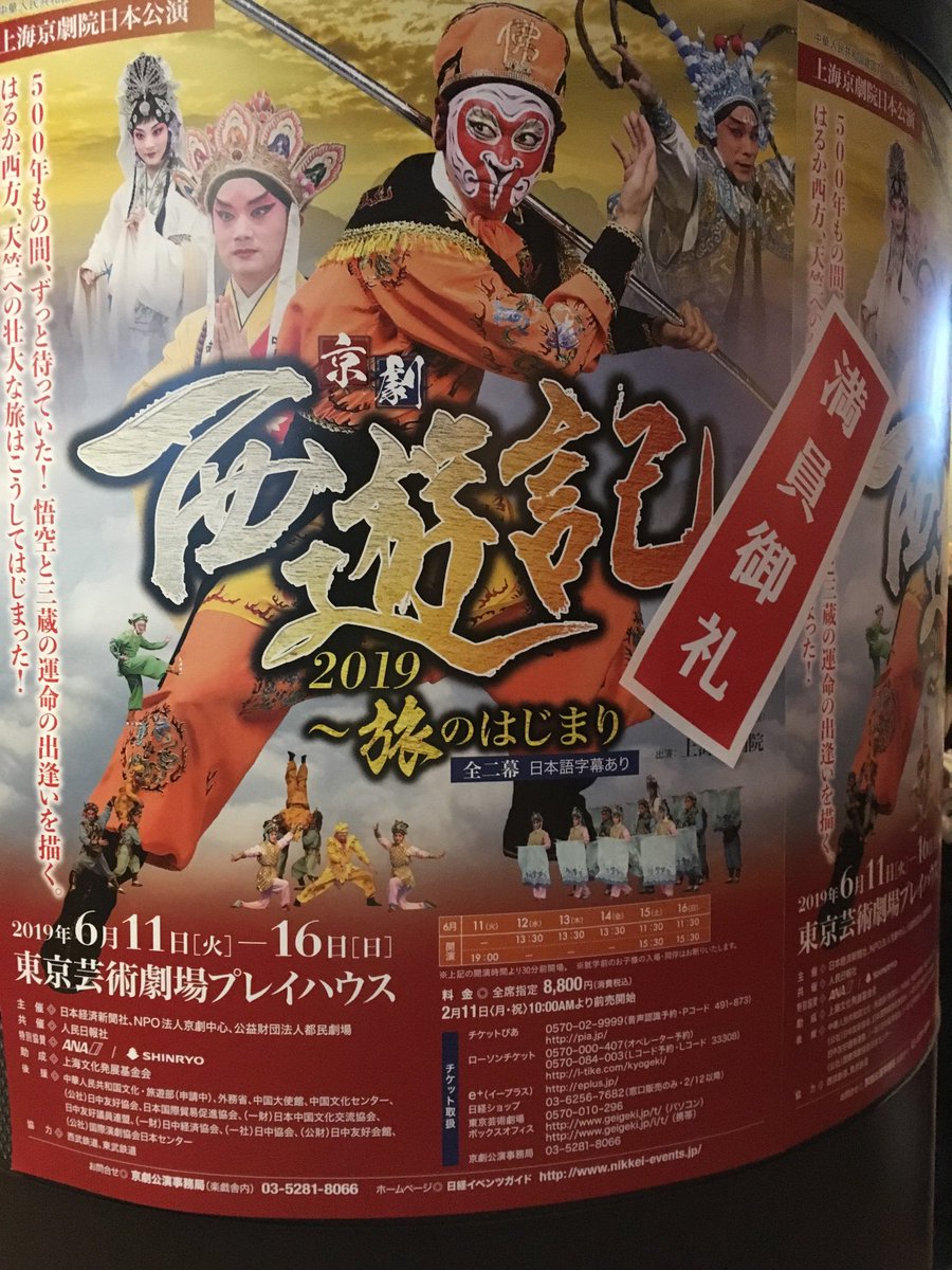 【イベント】 上海京劇院の6月日本公演「京劇西遊記2019~旅のはじまり」(日本語字幕付き)、東京公演の一部と大阪公演がチケット完売しました。鑑賞ご希望の場合は事前のチケット確保がおすすめです。 日経イベンツガイド内紹介… https://t.co/GWDb2nATUK
