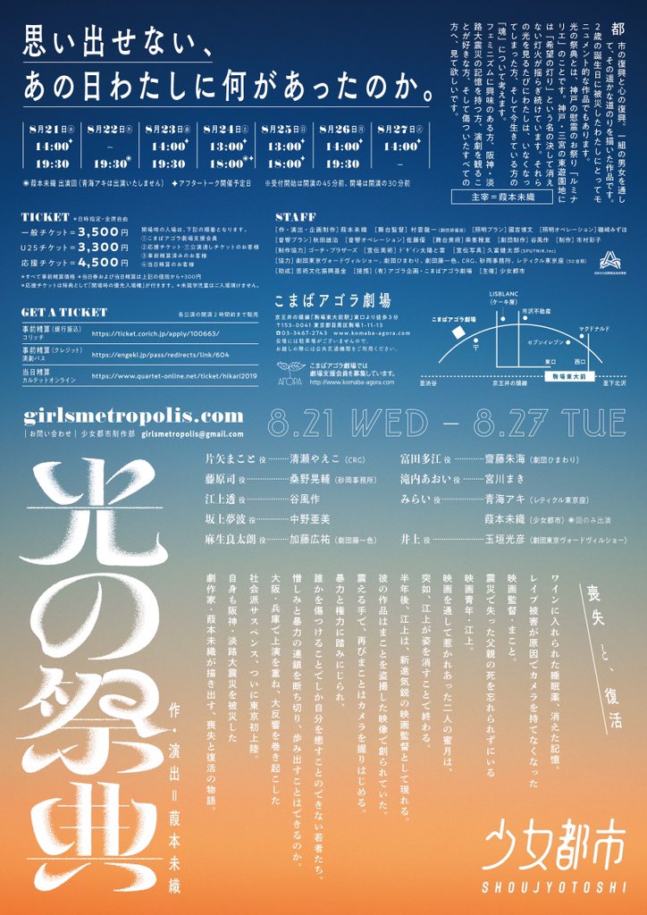 2019/8、こまばアゴラ劇場、光の祭典、少女都市。② 本作の「睡眠薬」や前作「向井坂良い子」の「演劇を殺して…」など作者インタビューを読むと実体験で云々と多少は理解できるが劇中で説明不足。話の設定や展開が強引。(小説も書かれるよ… https://t.co/mrIc5de3Jt