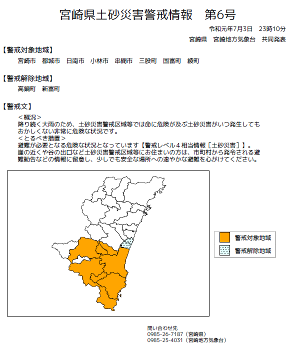 第6号 - 令和元年7月3日 23時10分 共同発表 【 宮崎市 都城市 日南市 小林市 串間市 三股町 国富町 綾町 https://t.co/qxSL1f62vH #宮崎県 #土砂災害警戒情報 #宮崎地方気象台 #警戒対象地域