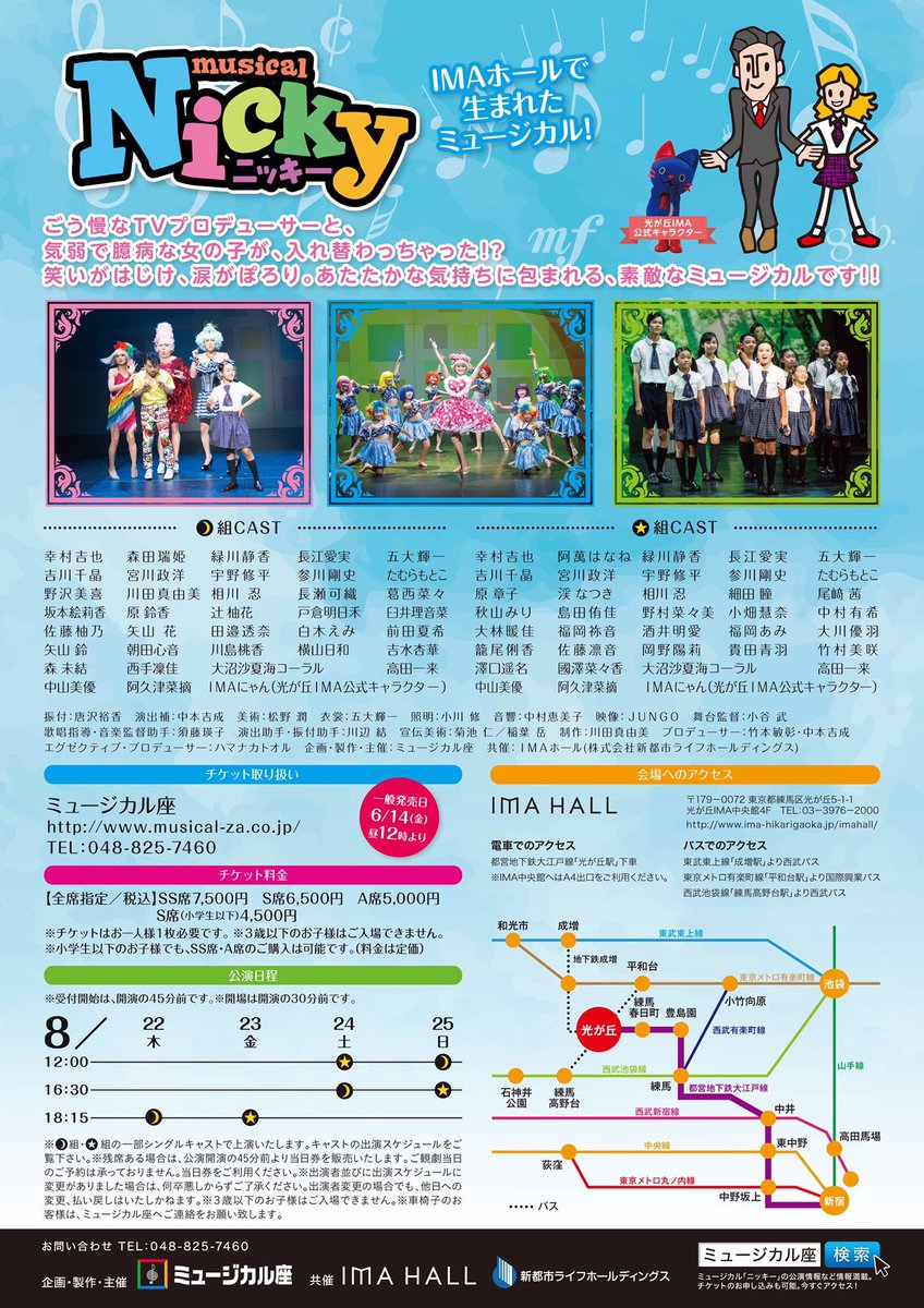 | 説明 | 強気で自分勝手な敏腕テレビプロデューサー、40男のニッキー(ニコラス)と、 気弱で臆病な10歳の女の子ニッキー(ニコル)の心が、ひょんなことから入れ替わる。 大人のプロデューサーになった女の子と、女の子になった40男。 周囲の人間は大混乱!!果たして、いったいどうなるの!? 笑いがはじけ、涙がぽろり。 あたたかな気持ちに包まれる、素敵なミュージカルです!! |