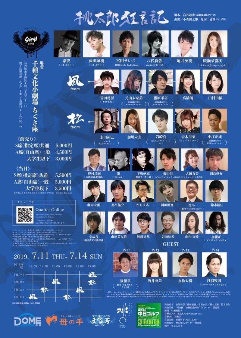 藤田誠樹卒業公演 「SCANP NINE~桃太郎狂言記〜」 @千種文化小劇場 脚本 :宮谷達也(演劇組織KIMYO) 演出 :小森耕太郎 原案 :憲俊(SCANP) 7/11(木)19:00 風 7/12(金)15:00 風… https://t.co/CHgOgDIYwa