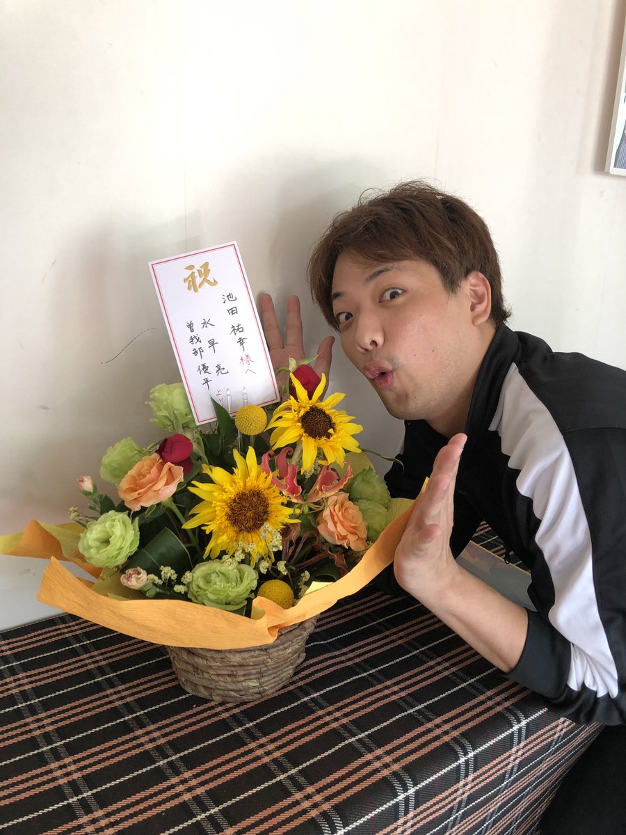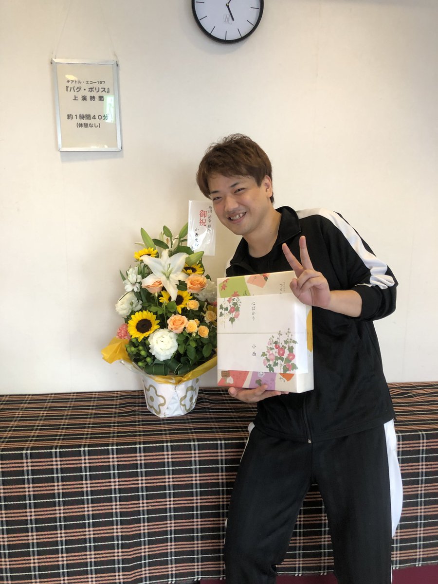 「バグ・ポリス」とうとう初日迎え、無事終演しました!!お越し頂きありがとうございました✨ 残り10ステージ、まだまだ盛り上げて行きます🔥 そして地元でお世話になった居酒屋のマスターから素敵なお花と差し入れ…感激です😭 https://t.co/DM0DyMaUKn