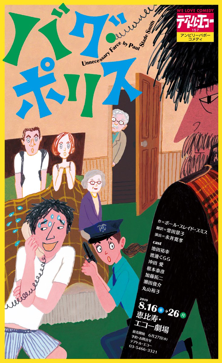 テアトル・エコー「バグ・ポリス」観劇だん。エコーお得意のドア芝居。8枚のドアがどったんばったん開閉するたびに、客席にどっかんどっかん笑いが起きた。千秋楽8/26(月)以外はまだ購入可能だって。レーティングはPG12くらいかな(笑) https://t.co/19GhhLtJZ7