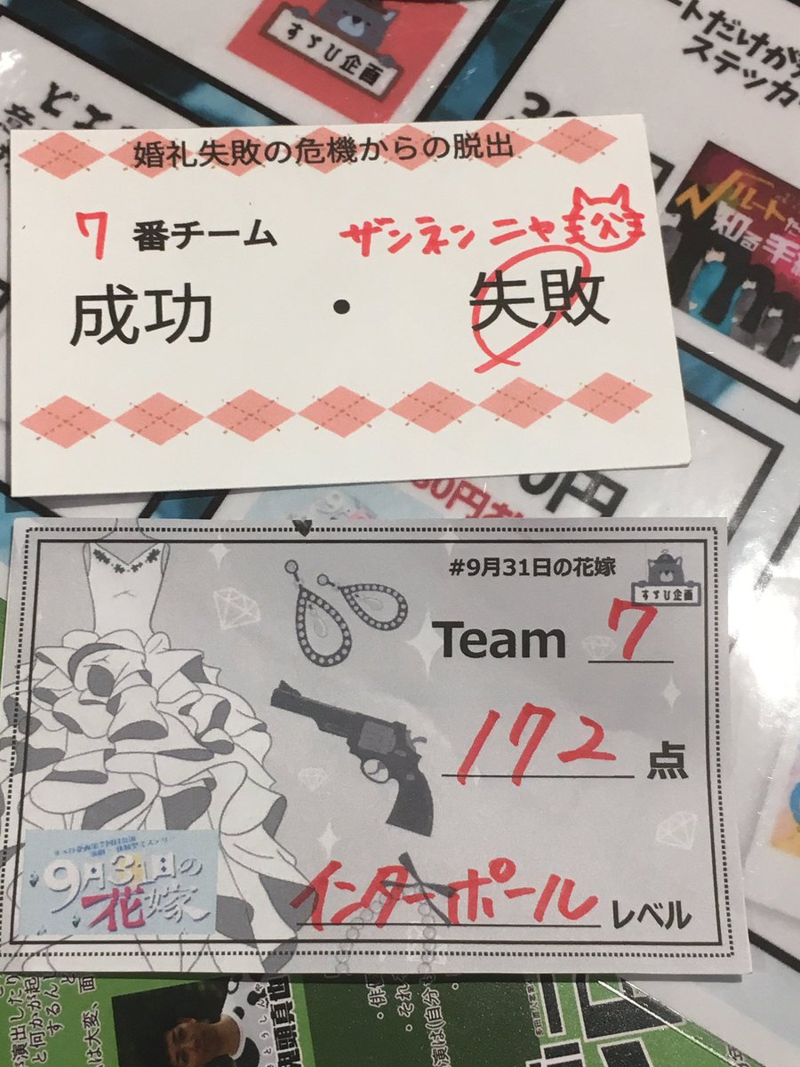 すゞひ企画『9月31日の花嫁』 リピーターで行ってきました。 テーブルのみなさんがめっちゃすごかったから、奇跡の300点取ったー!! 私は、今回は、証言集めに徹したのでした。前回できなかったから…。 証言集めめっちゃ緊張したけどね… https://t.co/FJgRiZODAg