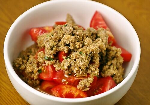 【タンタントマト】 干しえび10gを水で戻し刻む 油を熱し刻みしょうがとにんにく各大さじ2→えび→豚挽き肉200g→豆板醤小さじ1を炒め、酒・すりごま・醤油各大さじ2味噌小さじ1ごま油とラー油各大さじ1を加えトマトにかけるだけ♪https://t.co/OyYnFBQzR8